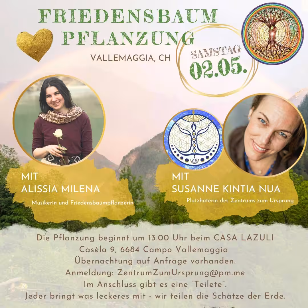 Am Samstag, den 2. Mai, findet in Vallemaggia (CH) eine besondere Friedensbaum-Pflanzung statt. Die Veranstaltung beginnt um 13:00 Uhr beim Casa Lazuli in Casèla 9, 6684 Campo Vallemaggia. Begleitet wird die Pflanzung von Alissia Milena, Musikerin und Friedensbaumpflanzerin, sowie von Susanne Kintia Nua, der Platzhüterin des Zentrums zum Ursprung. Im Anschluss ist eine gemeinsame „Teilete“ […]