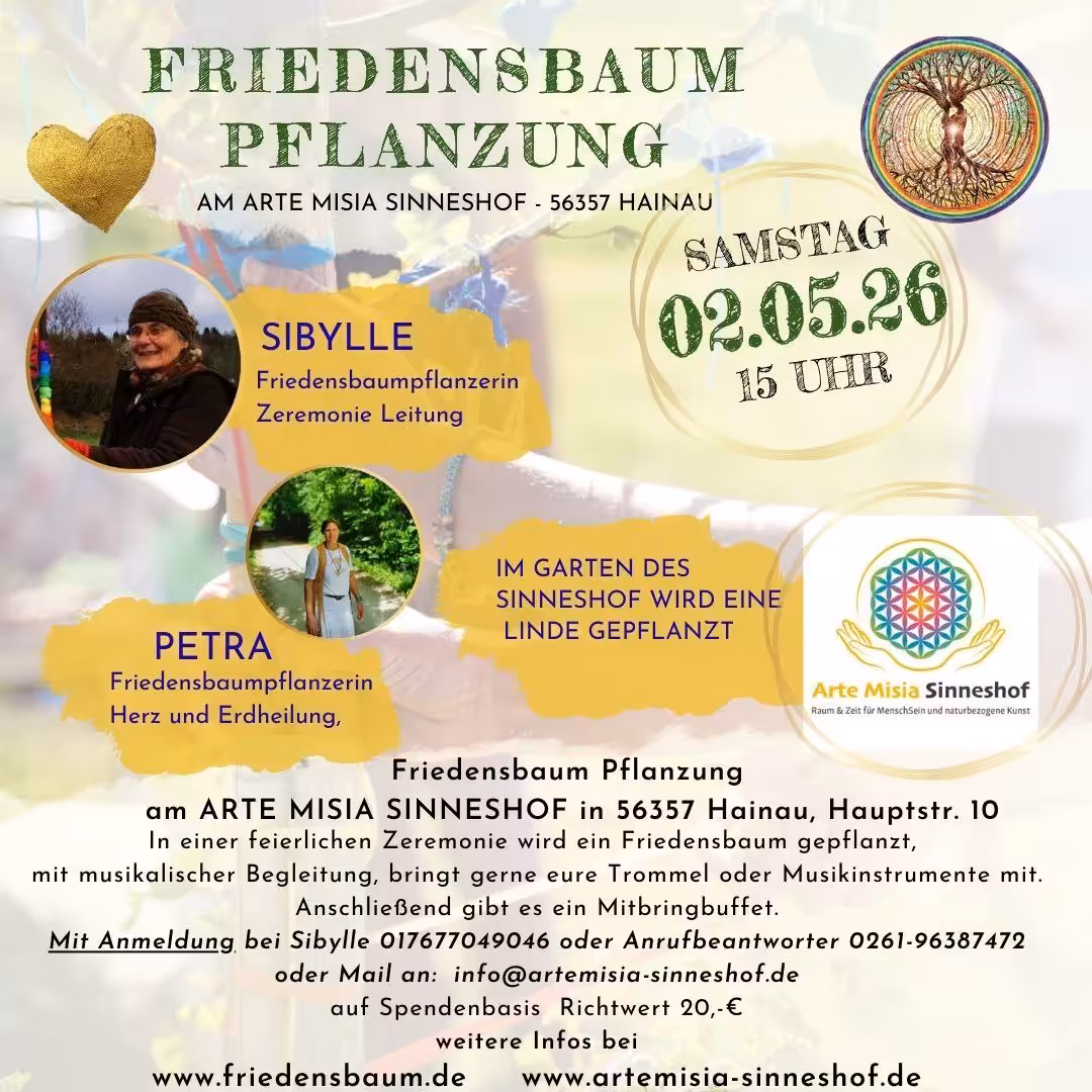 Am Samstag, den 2. Mai 2026, lädt der Arte Misia Sinneshof in 56357 Hainau zu einer besonderen Friedensbaum-Pflanzung ein. Beginn ist um 15 Uhr am Arte Misia Sinneshof, Hauptstraße 10. Im Garten des Sinneshofs wird dabei eine Linde gepflanzt, begleitet von einer feierlichen Zeremonie. Die Veranstaltung wird von Sibylle als Friedensbaumpflanzerin und Zeremonieleitung sowie von […]