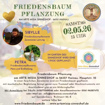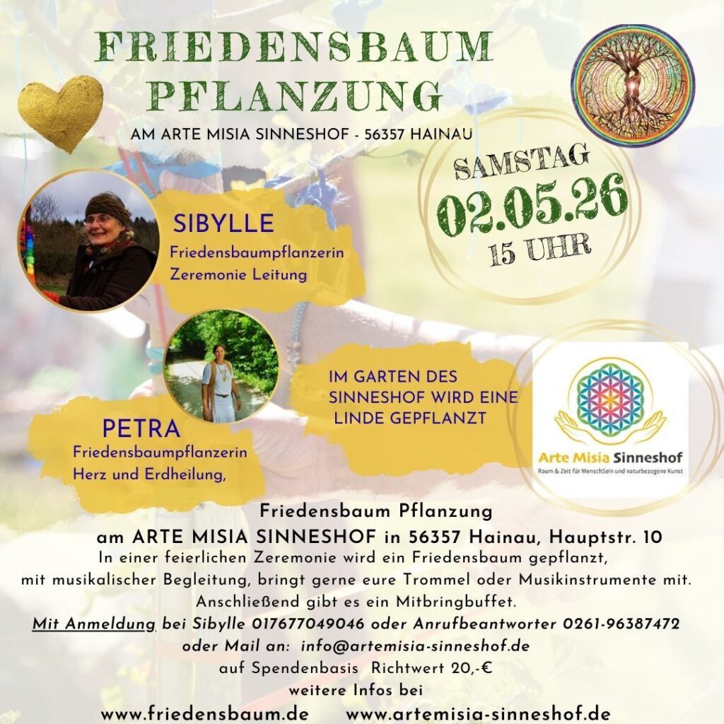 Am Samstag, den 2. Mai 2026, lädt der Arte Misia Sinneshof in 56357 Hainau zu einer besonderen Friedensbaum-Pflanzung ein. Beginn ist um 15 Uhr am Arte Misia Sinneshof, Hauptstraße 10. Im Garten des Sinneshofs wird dabei eine Linde gepflanzt, begleitet von einer feierlichen Zeremonie.