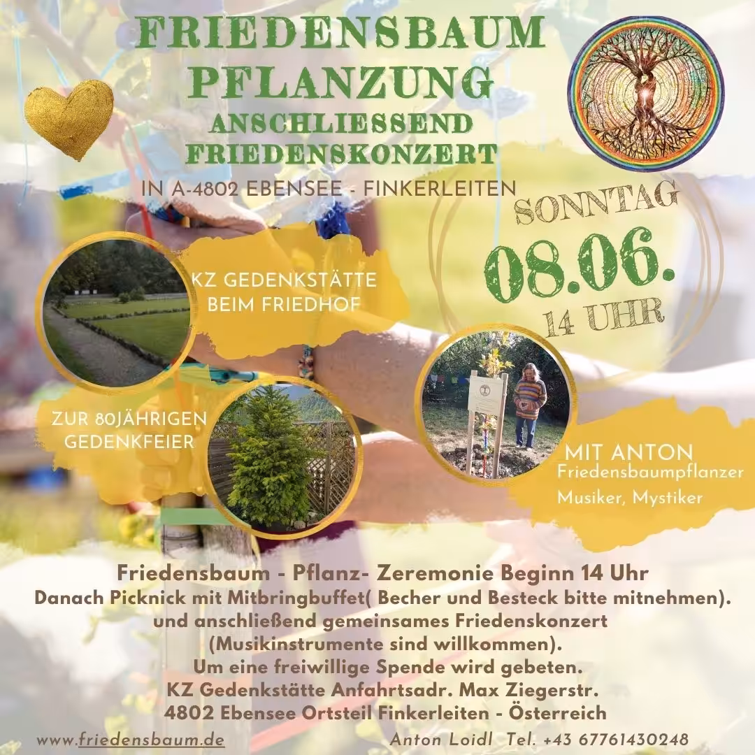 Geliebte Menschheitsfamilie! 🌎🌍🌏 Mit Freude im 💗 möchte ich euch einladen zur Friedensbaumpflanzung 🌲♾ 🌳 am Pfingstsonntag. Diese Friedensbaumpflanzung mit anschließendem Friedenskonzert 🎵🎶 beginnt um 14 Uhr beim KZ – Friedhof in Ebensee. Wir, der Ort und auch der Friede freuen sich über jeden beherzten Menschen, welcher an diesem besonderen Tag an diesem besonderen Ort […]