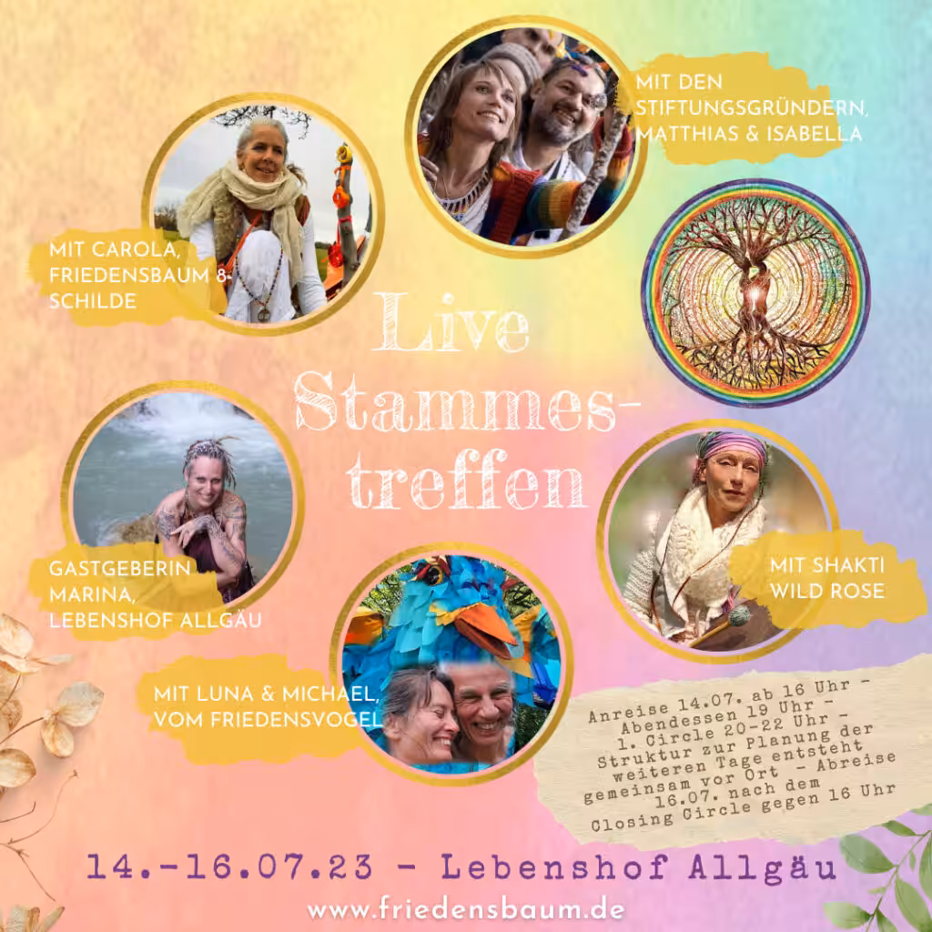 Mit größter Wertschätzung an das gesamte 8 Schilde Team der Friedensbaum Stiftung könnt ihr Euch hier direkt für unser allererstes Live-Treffen des Rainbow Spirit Medicine Tribes vom 14.-16.7. bei Marina am Lebenshof anmelden – Wir freuen uns auf Dich https://friedensbaum.de/stammestreffen